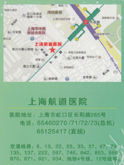 醫(yī)院位于虹口區(qū)長(zhǎng)陽(yáng)路、保定路路口。醫(yī)院占地面積914㎡,建筑面積3153㎡。后經(jīng)收購(gòu)一樓體檢并經(jīng)擴(kuò)建,實(shí)際建筑面積達(dá)到4416㎡。